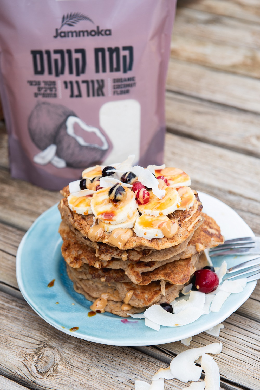 4. מחממים מחבת על אש בינונית עם 2-3 כפות שמן קוקוס. בעזרת מצקת מוזגים למחבת מהבלילה - לשים לב לא ליצור פנקייקים עבים מידי.