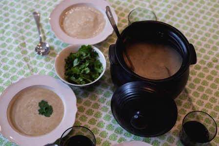מרק כרובית מוקרם טבעוני בקדרת בישול דוֹנָאבֵּה